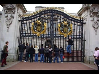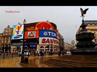 This document provides a tour of various landmarks in London including Picadilly Circus, Nelson Memorial, St. James Park, Westminster Abbey, Big Ben, Parliament, Westminster Bridge, the London Eye, St. Paul's Cathedral, Tower Bridge, Harrod's, the Tower of London, Buckingham Palace, the Albert Bridge, Camden Market, Marble Arch, Lloyd's Building, Trafalgar Square, and views of the River Thames.