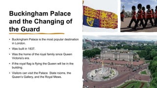 The document lists and describes 6 top attractions in London: Buckingham Palace and the Changing of the Guard, known for its royal residence and changing ceremony; the Tower of London, a historic site featuring the Crown Jewels and executions; the British Museum containing artifacts from around the world; Big Ben and Parliament, featuring tours of the government building and debates; the National Gallery housing European paintings; and the Victoria and Albert Museum founded in 1852 containing over 5000 years of art history.
