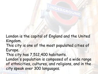 London is the capital of England and the United Kingdom, with a population of over 7.5 million people from diverse ethnic and cultural backgrounds. Some of the most famous landmarks to visit include the Tower of London, Big Ben, Trafalgar Square, Abbey Road, St. Paul's Cathedral, Tower Bridge, Buckingham Palace, as well as numerous museums. London is also known as the birthplace of important historical figures such as Charles Darwin, Charles Dickens, William Shakespeare, Isaac Newton, and others. The city offers a vibrant culture and nightlife alongside beautiful parks and neighborhoods.