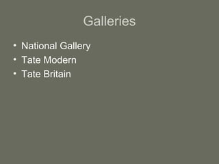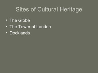 London attracts over 14 million international visitors per year, making it the most visited city in Europe. Some of the top attractions include the British Museum, Tate Modern, National Gallery, Natural History Museum, and many others. London offers world-class museums such as the British Museum, Natural History Museum, Victoria and Albert Museum, and Science Museum that house extensive collections. It is also known for its iconic architecture like St. Paul's Cathedral, Houses of Parliament, Buckingham Palace, bridges, and Big Ben. Cultural heritage sites include Shakespeare's Globe Theatre and the Tower of London, home to the Crown Jewels.