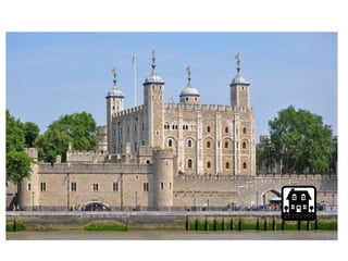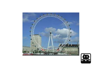 The document discusses several famous London landmarks including the London Eye, Buckingham Palace, Big Ben, the Tower of London, and St. Paul's Cathedral. It provides brief descriptions of each landmark and the costs to visit or take a tour.