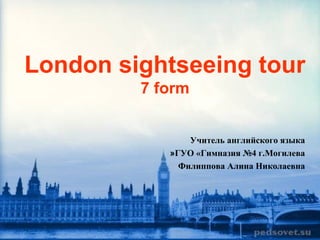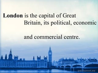 London is divided into 4 parts - The City, Westminster, The West End, and The East End. The City is the oldest and financial district, Westminster is the official district, the West End is richest, and the East End is industrial. Key landmarks include Big Ben and the Houses of Parliament in Westminster, St. Paul's Cathedral built after the Great Fire, Piccadilly Circus square known for shops and food, and Westminster Abbey where coronations occurred.