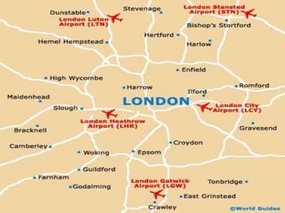 This document provides brief descriptions of several iconic London landmarks such as Big Ben, the London Eye, Trafalgar Square, and Piccadilly Circus. It also mentions London Bridge and the city's underground transit and telephone networks. The document gives a high-level overview of some of the most famous sights and infrastructure that define London.