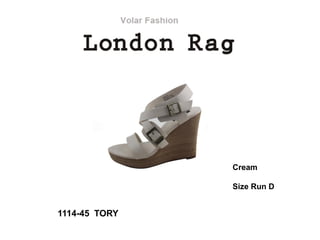 This document contains product information for three items: 1114-45 TORY Cream shoes in size run D, 4610-39 Peggy Cognac shoes in size run B, and 1114-49 TYLOR Taupe shoes in size run B.