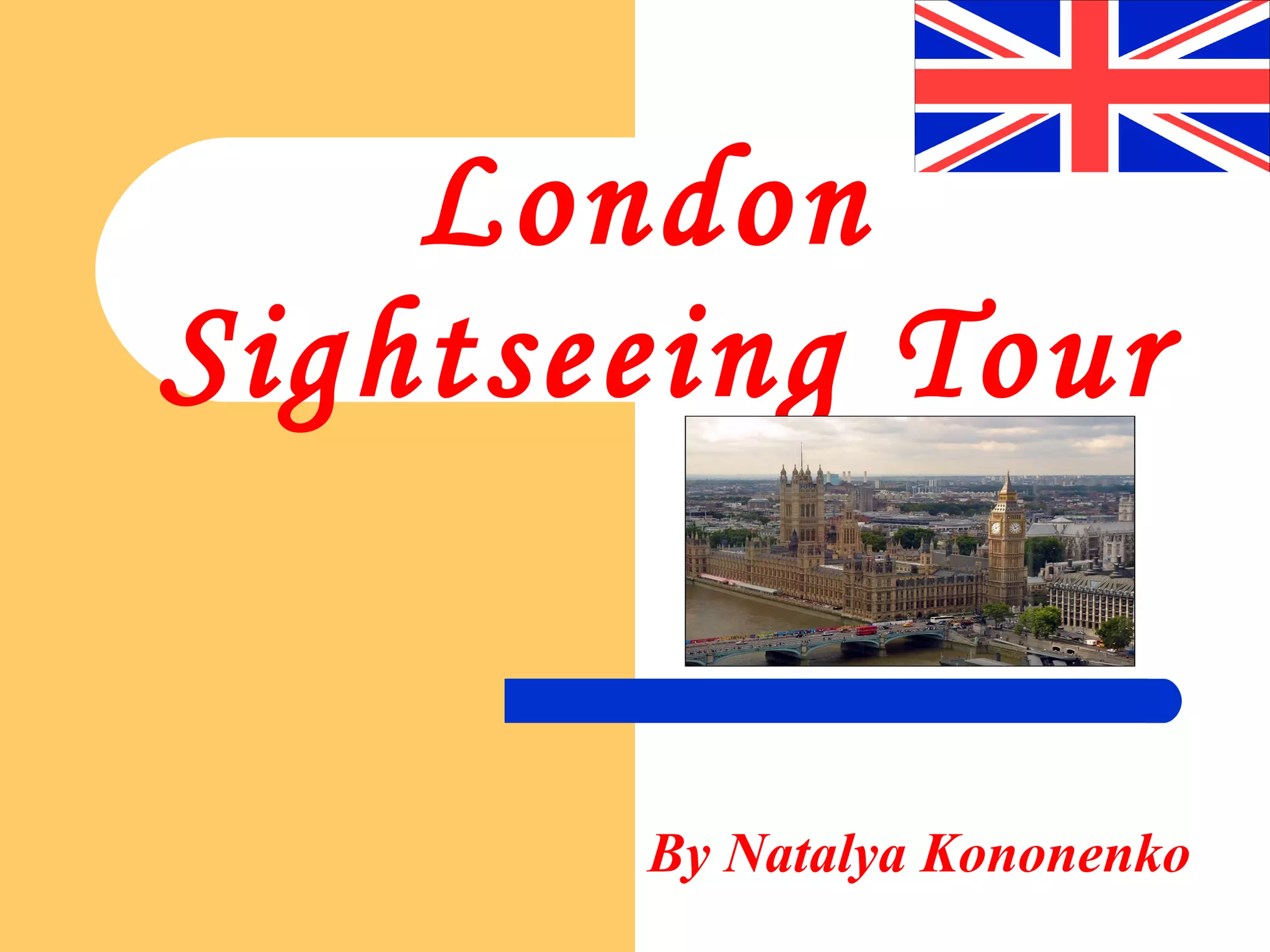 This document provides a summary of a sightseeing tour of London that visits many of the city's most famous landmarks over the course of a double-decker bus tour, including: Trafalgar Square, the National Gallery, Piccadilly Circus, Buckingham Palace where the Changing of the Guard occurs daily, St. James's Park, the Houses of Parliament and Big Ben, Westminster Abbey, Tower Bridge, the Tower of London, St. Paul's Cathedral, and concluding at Madam Tussaud's Wax Museum.
