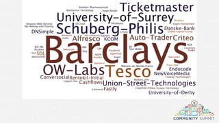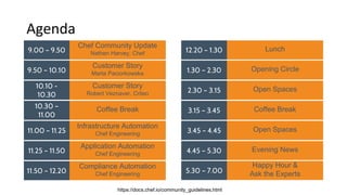 The document contains an agenda for a Chef community event. The agenda includes presentations from Chef engineering on infrastructure automation, application automation, and compliance automation. There will also be customer stories, coffee breaks, lunch, opening and closing circles, and open space sessions. The agenda for the following day includes more from Chef engineering, more customer stories and demos, and more open space sessions.