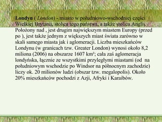 Londyn ( London ) - miasto w południowo-wschodniej części Wielkiej Brytanii, stolica tego państwa, a także stolica Anglii. Położony nad , jest drugim największym miastem Europy (przed po ), jest także jednym z większych miast świata zarówno w skali samego miasta jak i aglomeracji. Liczba mieszkańców Londynu (w granicach tzw. Greater London) wynosi około 8,2 miliona (2006) na obszarze 1607 km²; cała zaś aglomeracja londyńska, łącznie ze wszystkimi przyległymi miastami (od na południowym wschodzie po Windsor na północnym zachodzie) liczy ok. 20 milionów ludzi (obszar tzw. megalopolis). Około 20% mieszkańców pochodzi z Azji, Afryki i Karaibów.