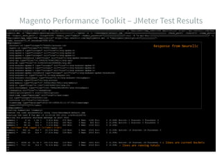 The document outlines best practices for optimizing and scaling Magento applications, focusing on server configurations, caching strategies, and deployment automation. It highlights the importance of maintaining a clean codebase and utilizing tools such as Vagrant, Puppet, and various caching mechanisms like Redis to improve performance. The document also emphasizes the need for rigorous testing and a solid development pipeline for efficient deployment and ongoing maintenance.