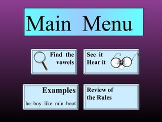 This document is a learning tool about long vowels. It contains interactive exercises and examples to teach readers about vowel combinations that make long vowel sounds. The main rules covered are that "ee" makes the long e sound, a single "e" at the end makes a long e sound, a single "y" at the end makes a long i sound, an "e" at the end of a word makes the first vowel long, and when two vowels are together the first vowel is long. It also discusses vowel combinations like "igh", "eigh", "ow", "oo", and "ew" that make specific long sounds.