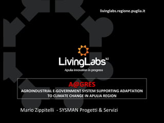 Il documento presenta il progetto A@GRES, un sistema informativo per quantificare l'impatto dei cambiamenti climatici sul settore agroalimentare in Puglia. Questo sistema include la creazione di una banca dati agroalimentare regionale e strumenti per l'analisi, promuovendo la collaborazione tra enti pubblici, aziende e cittadini. L'obiettivo è migliorare la comunicazione e la gestione delle informazioni riguardanti le politiche di mitigazione degli effetti climatici.