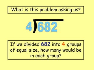 The document provides step-by-step instructions for solving division problems. It demonstrates how to divide multi-digit numbers by breaking the problem down into a series of single-digit divisions, starting from the left. Users are guided through examples like 682 divided into 4 groups, 8,437 divided into 6 groups, and shown how to determine the quotient and any remainder. Real-life word problems are also provided to put the division concepts into context.