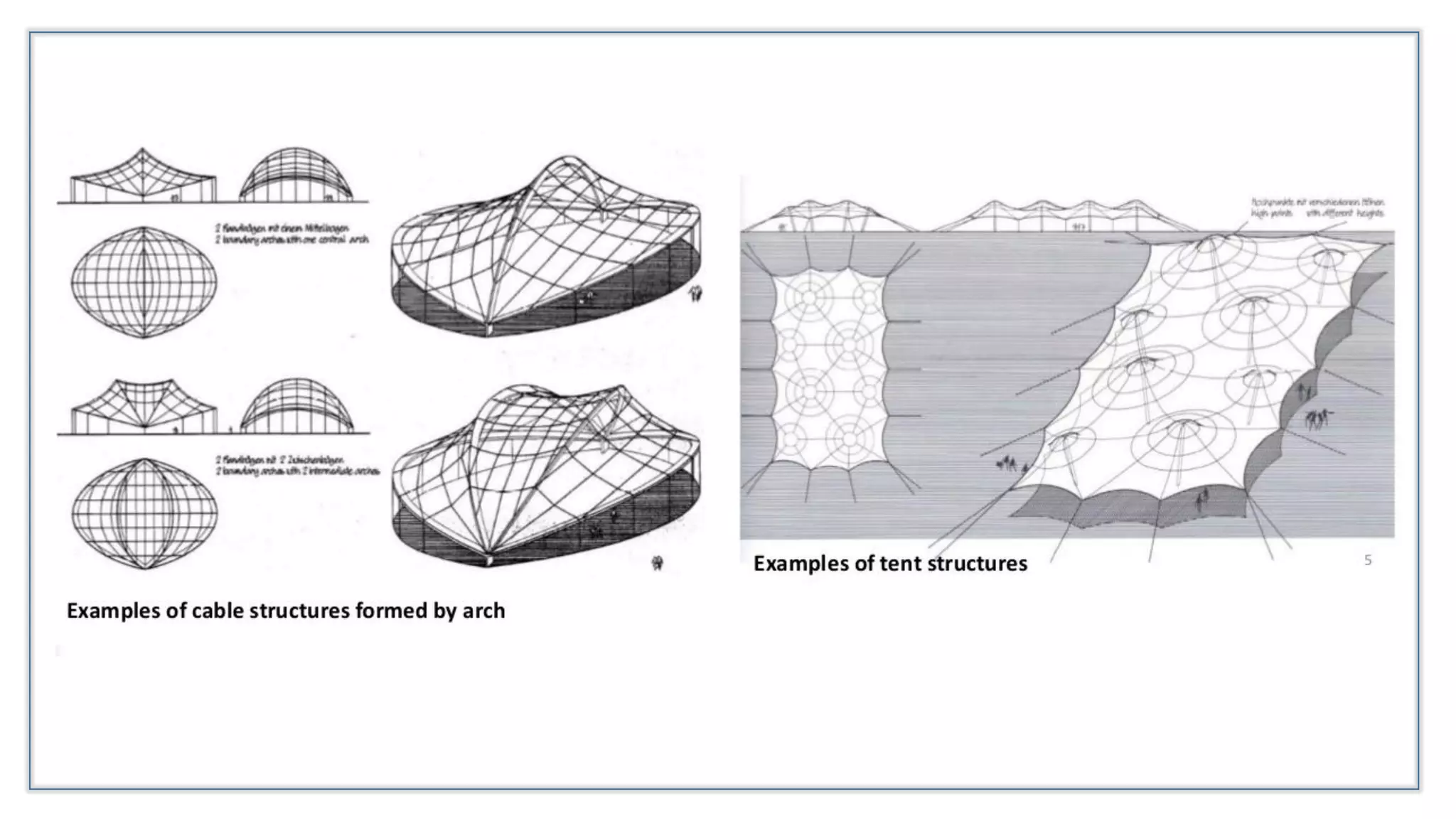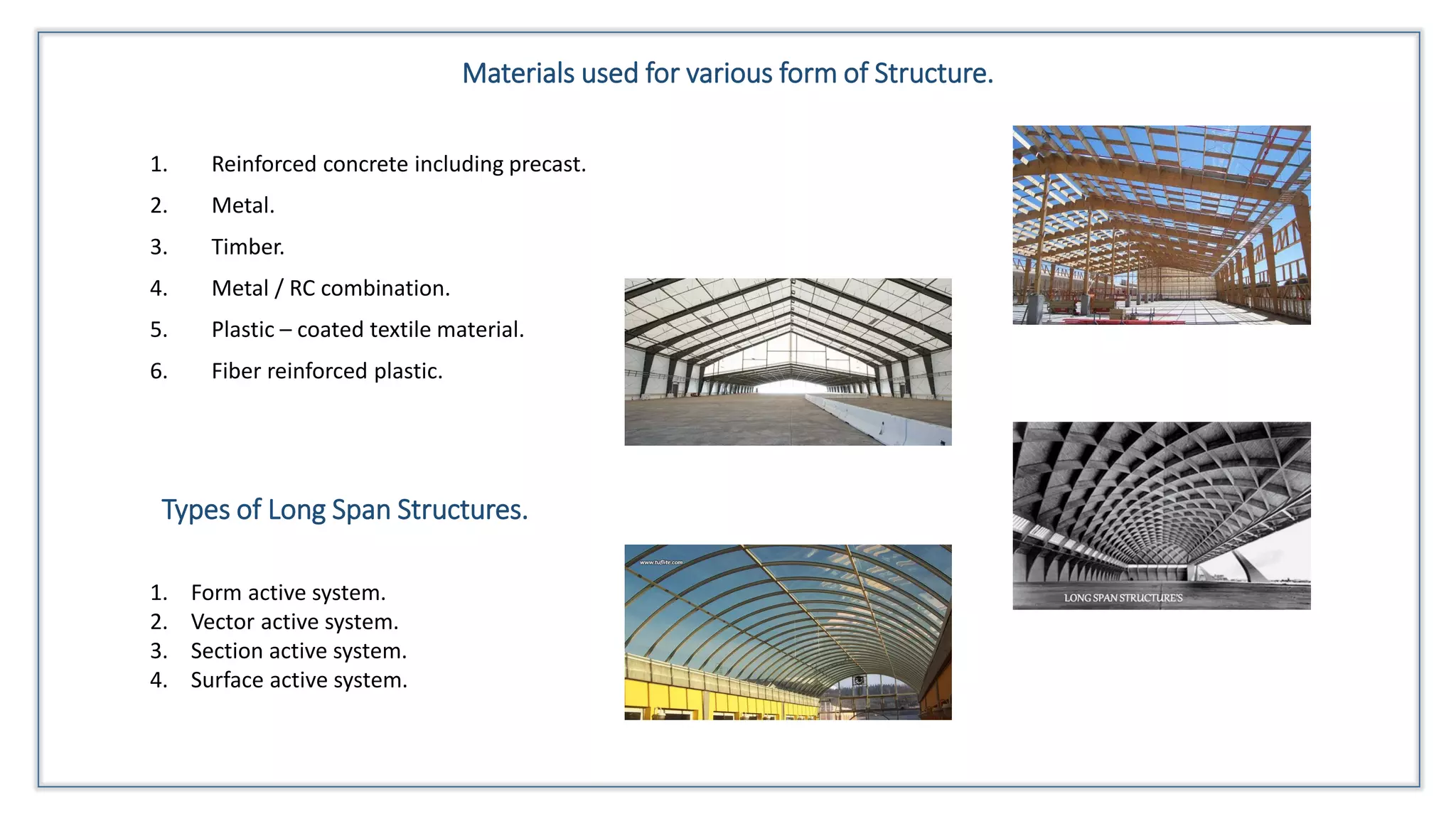 3. Common materials for long span structures are reinforced concrete, metal, timber, metal/concrete combinations, plastics, and fiber reinforced plastics.
