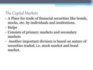 This document discusses various forms of long term debt financing for companies. It describes capital markets which facilitate the trade of securities like stocks and bonds. Private placements involve direct selling of bonds to a small number of qualified institutional investors like banks and insurance companies. Commercial papers are short term unsecured notes issued by large companies and financial institutions with maturities of up to nine months. Corporate bonds are longer term debt instruments issued by corporations to raise funds. Medium term notes have maturities between 5-10 years and combine aspects of commercial papers and corporate bonds.