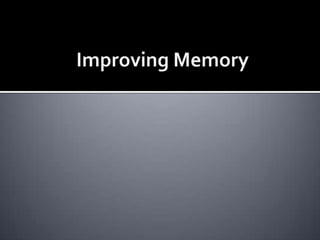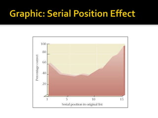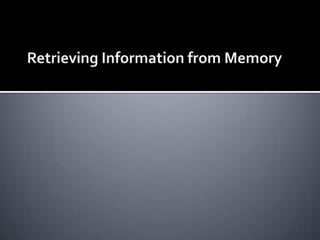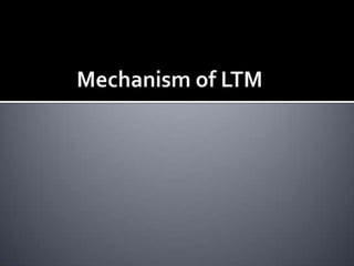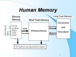The document discusses various aspects of long-term memory, including its types (declarative, procedural, semantic, episodic, emotional) and factors affecting memory formation and recall. It explains different amnesia types, memory retrieval methods (recall, recognition, relearning), and theories of forgetting like encoding failure, decay, and interference. Additionally, it highlights techniques for enhancing memory retention, such as mnemonics, spaced practice, and the importance of physiological factors.