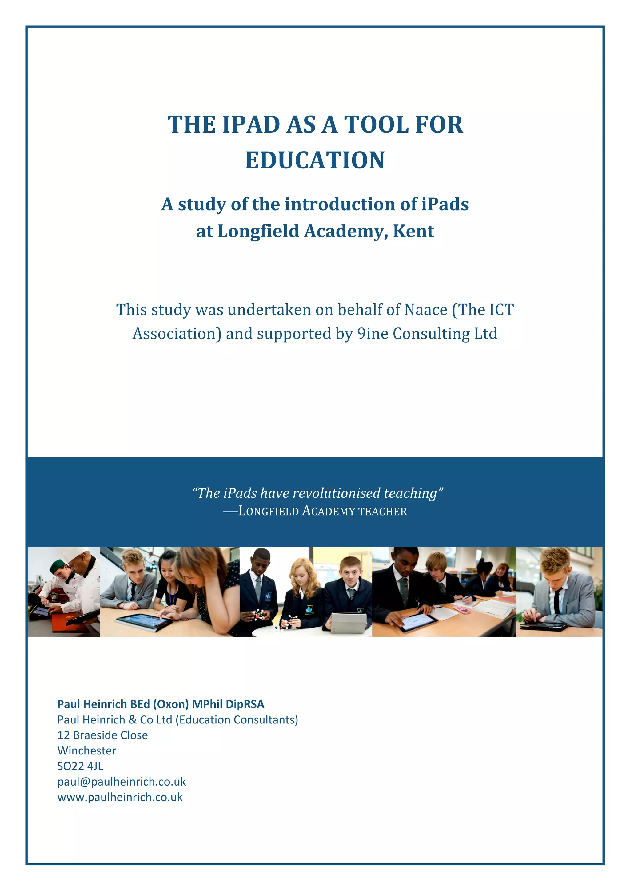 This document summarizes a study on the introduction of iPads at Longfield Academy in Kent. The study found that both teachers and students reported high levels of iPad use in lessons across all subjects. Teachers and students indicated that iPads improved student motivation, work quality, progress, achievement, and collaborative working. Students regularly used iPads for research, note-taking, creating presentations, and using subject-specific apps. The iPads were seen as revolutionizing teaching at the school.