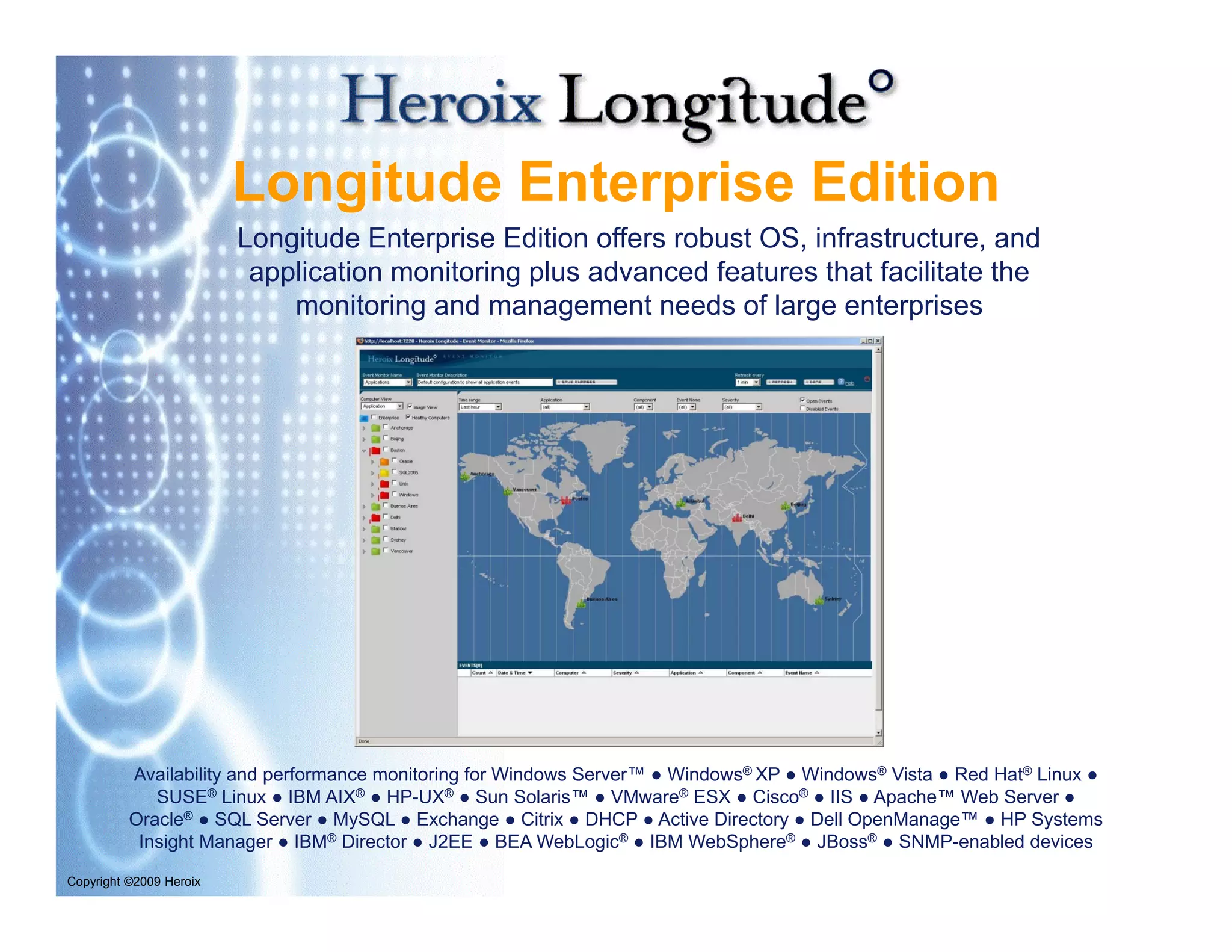 Longitude Enterprise Edition is a monitoring solution that provides robust OS, infrastructure, and application monitoring for large enterprises. It offers availability and performance monitoring across many platforms and applications. Key features include an event monitor, alerts and actions, statistics dashboards, reporting, service level agreements monitoring and reporting, event correlation, and topology views.