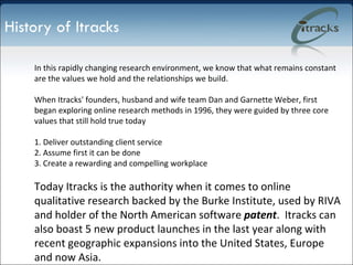 The document discusses online qualitative research tools and methods. It provides a history of the company Itracks and how online qualitative research has evolved since the 1990s with the growth of the internet. It then outlines several online qualitative research techniques like online focus groups, bulletin board focus groups, and additional services like iMarkIt for concept testing. It discusses the advantages of these online qualitative methods and how they can support quantitative research.