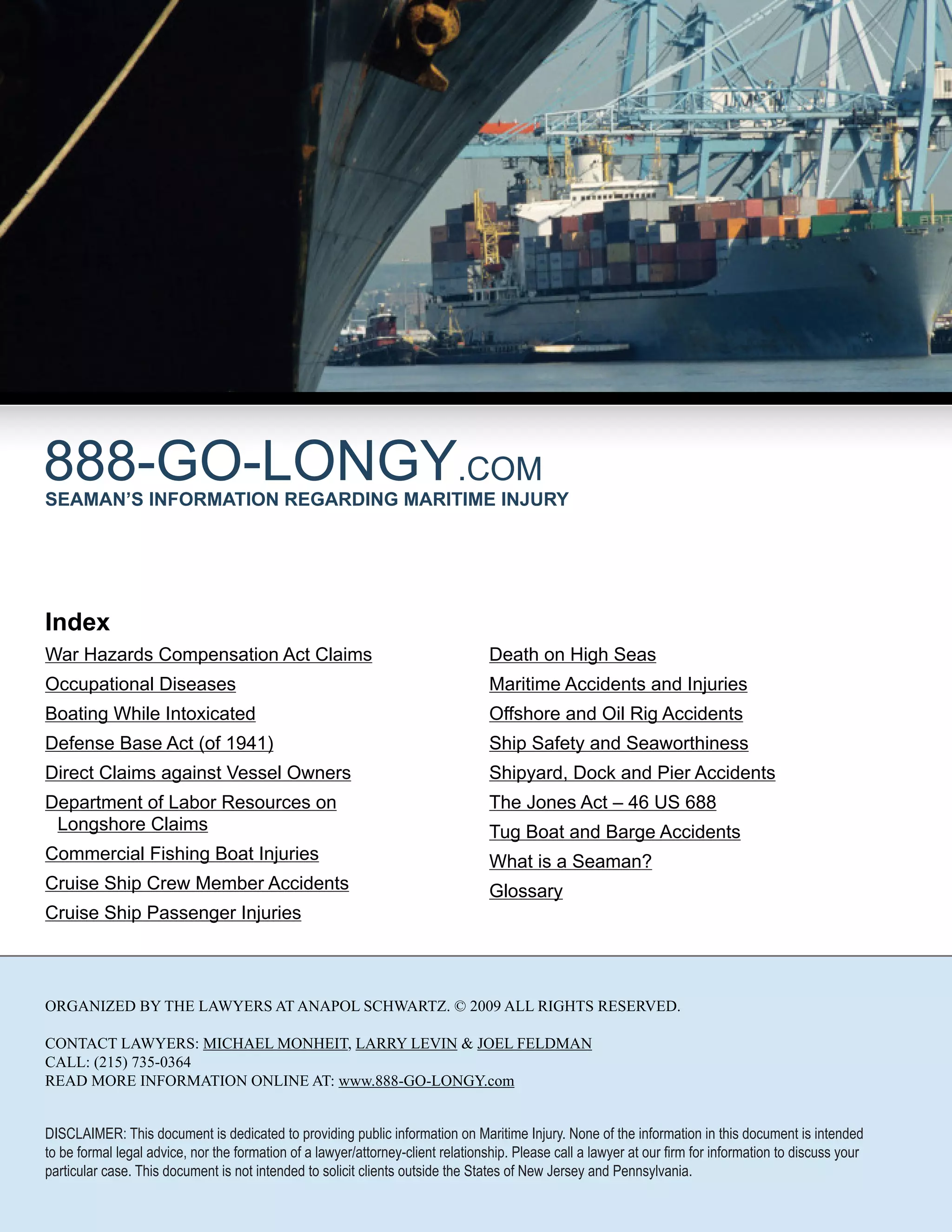 The document provides information about maritime injury claims and laws. It discusses several topics: - The War Hazards Compensation Act which covers injuries to non-military workers performing jobs related to war efforts overseas. It provides maximum weekly and yearly compensation amounts. - Occupational diseases longshoremen may contract and the information needed for a claim, including medical history and exposure details. Benefits provided under the Longshore and Harbor Workers' Compensation Act are outlined. - The Defense Base Act which is an extension of the LHWCA providing benefits to employees of US government contractors injured overseas. It has been amended over time to cover more contracts, companies and workers during various military engagements abroad.