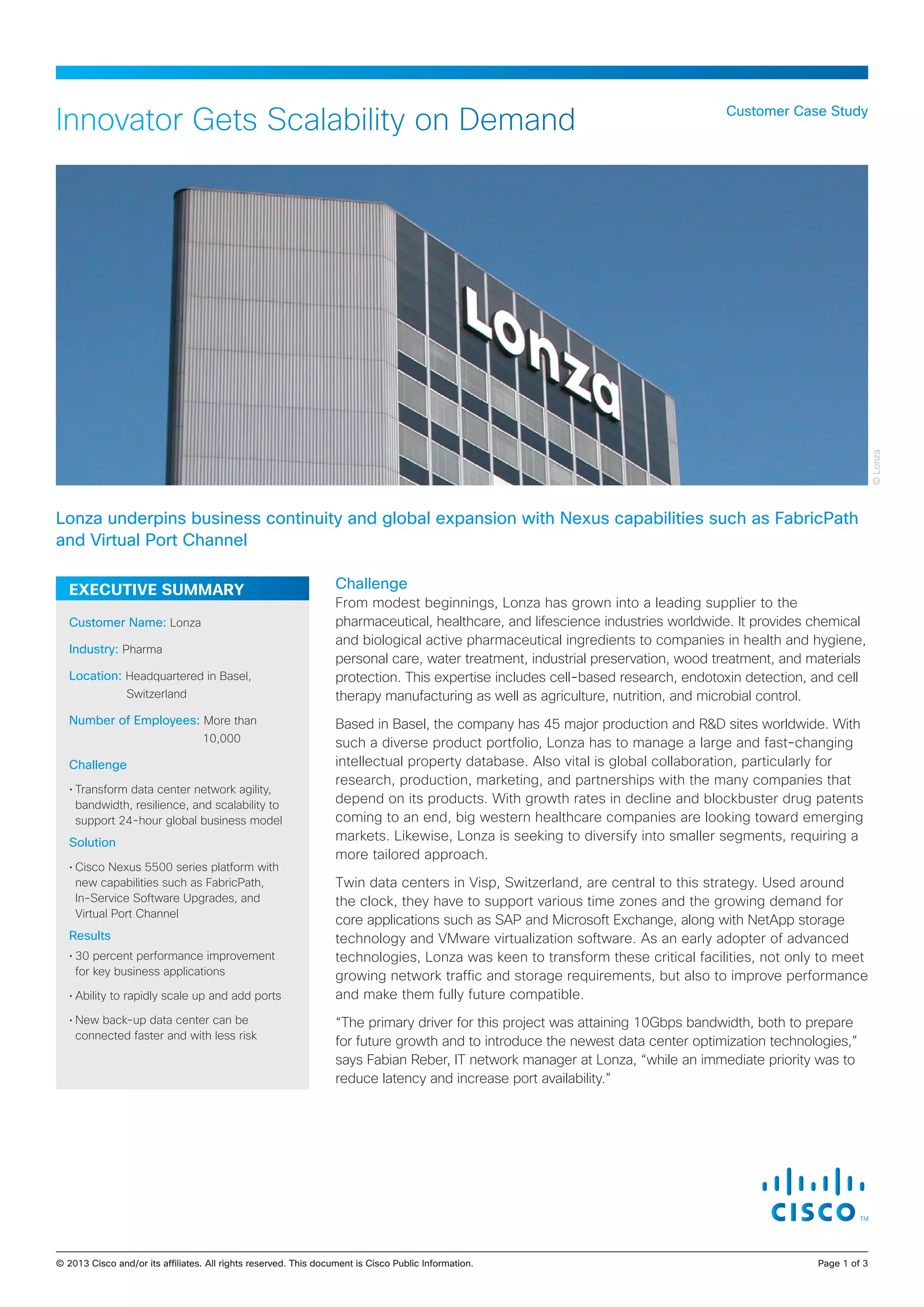 Lonza, a global leader in supplying pharmaceutical and life science industries, faced challenges in managing a diverse product portfolio and the need for global collaboration amid declining blockbuster drug patents. To enhance data center performance and scalability, the company implemented Cisco Nexus technologies, achieving up to 30% improvements in operational efficiency and customer responsiveness. The solution enables seamless interconnection among data centers, facilitating future growth without service disruptions.