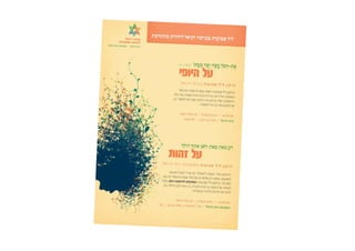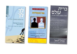 The document discusses branding and logo design for Jewish organizations. It provides three case studies of evolving branding strategies for Reuven Mass Publishing, Beit Daniel, and Beit Avi Chai. Common tips discussed include that a logo is not just a visual but represents underlying values; consistency is important but designs can be tweaked; and Jewish brands are similar to other brands but may "kvetch" or complain a bit more.