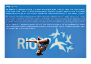 The Rio 2007 Pan and Parapan American Games branding project sought to convey the spontaneity and warmth of Rio de Janeiro through its visual identity. Over 5,500 athletes from 42 countries competed in 41 sports at the Games, which were broadcast to over 150 countries and drew over 1 million spectators. The branding incorporated elements representing Rio like landscapes and birds to create a unified visual language for promoting the Games.