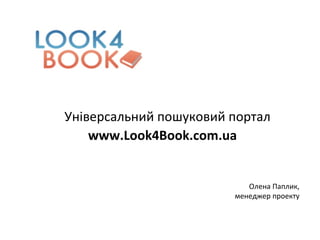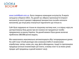 www.Look4Book.com.ua було створено командою ентузіастів, ß- версія запущена в березні 2011. На даний час зібрано пропозиції 6 інтернет-магазинів (в якості джерел інформації використано онлайн-каталоги магазинів) ; до кінця року планується підключити ще стільки ж. Сайт було задумано не тільки як пошукову систему книг, а в першу чергу як централізовану базу даних про всі книжки які продаються та/або продавалися на ринку України. На даний момент база даних включає приблизно 280.000 різних видань. Ми намагаємось максимально автоматизувати збір і впорядкування даних. На сайті існує чіткий розподіл між книжкою (тобто її незмінними атрибутами: автор, назва, рік, код, фото обкладинки, тощо) та пропозицією продавця (скільки екземплярів цієї книги, в якому стані та за якою ціною продає цей продавець в даний момент часу).