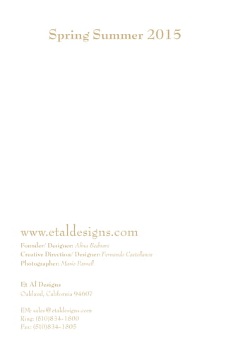 Et Al Designs is a design company located in Oakland, California that specializes in candles, candle holders, and home accessories. The company was founded by Alina Bednarz and is led by Creative Director Fernando Castellanos. Their Spring/Summer 2015 catalog features a variety of beeswax and wax blend candle collections, as well as ceramic, horn, wood, and resin candle holders. The catalog is distributed in the United States by Dr. Vranjes.