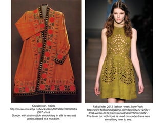 This look book summarizes trends in suede garments from fashion weeks between 2012-2015. It provides 15 examples of suede dresses, skirts, pants and jackets featuring techniques like laser cutting, embroidery, tassels and slits. The garments are generally described as smart, comfortable silhouettes that follow trends like earth tones, flares and metallic details. Accessories like roped belts, fringes and pockets are also highlighted.