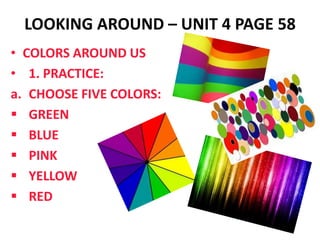 This document provides instructions and content for an English language lesson about colors, shapes, lines, and famous artists. It includes exercises to match country flags to their colors, practice indefinite articles, identify shapes, read about lines, and listen to a game identifying diagrams. It also shares information on famous Brazilian and international artists like Tarsila do Amaral, Candido Portinari, Romero Brito, Leonardo Da Vinci, Pablo Picasso, and Monet. For homework, students are asked to complete exercises on pages 62, 66, 144, and 145 and provided the teacher's email and blog information.