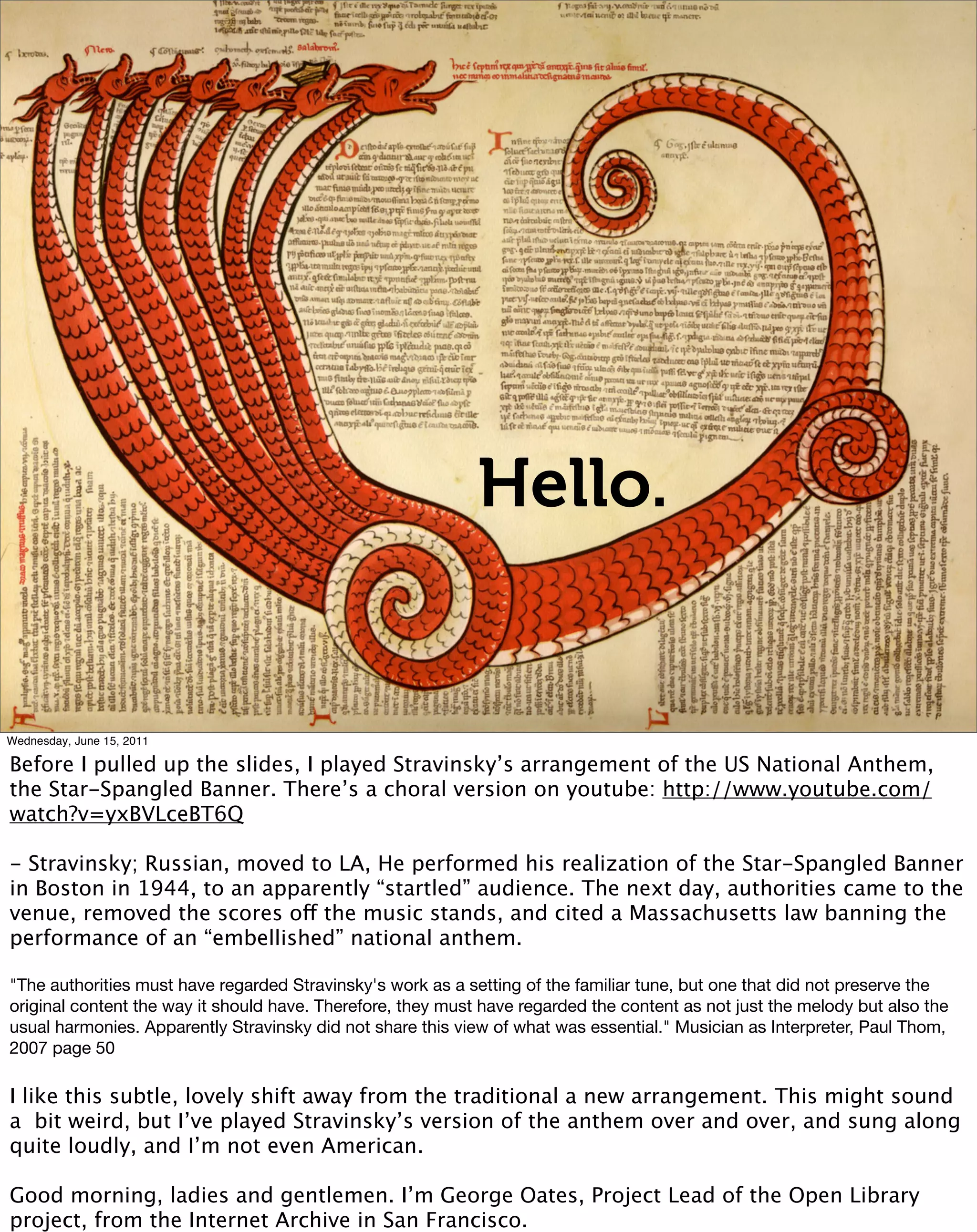The document is a presentation by George Oates, discussing the Open Library Project at the Internet Archive and exploring data consumption practices, emphasizing the blurred lines between production and consumption. Oates highlights the immediate cycle of data exchange and the importance of organization and interpretation in navigating the web's vast resources. He also shares examples of projects that illustrate these concepts, underlining the evolving nature of how information is produced and consumed online.