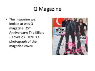 Q Magazine is a popular UK music magazine published by Bauer Media Group, a large German publishing company. It has a monthly circulation over 100,000 and covers different music genres to appeal to a wide but young audience. The magazine's logo and consistent layout make it easily recognizable to readers.