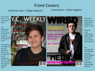 Looking back at her preliminary college magazine task, the author learned several important lessons that improved her final music magazine product. She realized she had not properly researched the audience or market for the college magazine. For the music magazine, she researched the target audience and created a pitch. She also planned articles, photos, and layouts more thoroughly. The final product had more professional design elements like drop shadows and organized sections compared to the preliminary task.