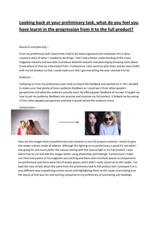 4) Skills in editing images using Photoshop and InDesign, and constructing a magazine without blank spaces that excites readers through layout, emphasized text, and natural lighting versus the preliminary task.