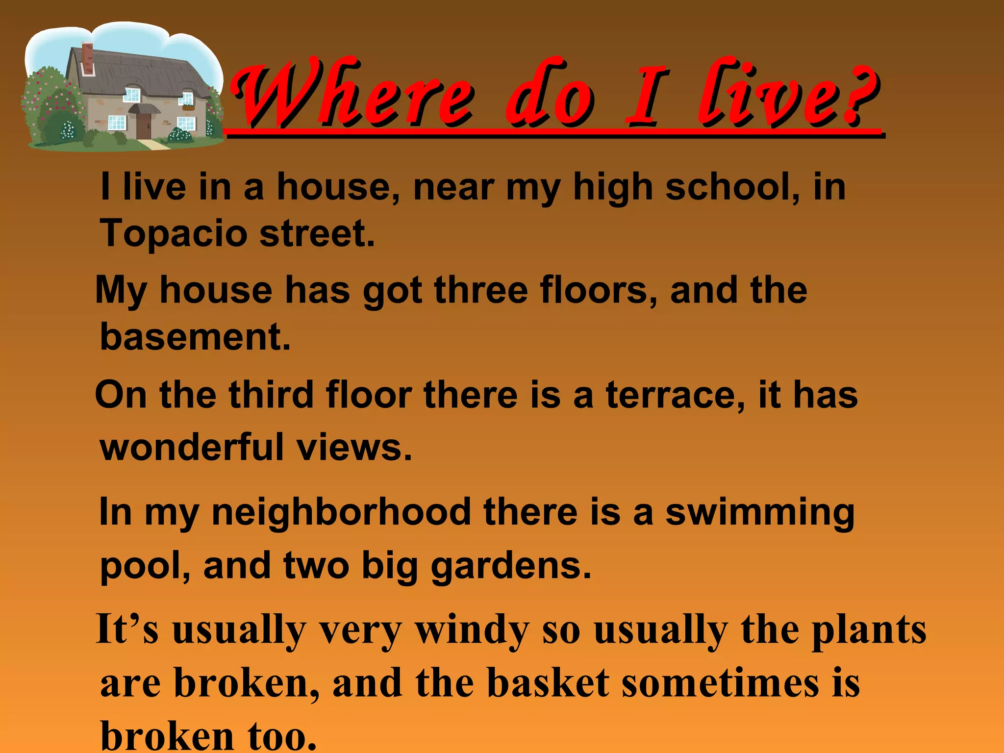 Paula lives in a three-story house near her high school in Topacio Street. Her neighborhood has a swimming pool and two large gardens that she and her friends enjoy playing in. From her window, Paula can see the cable car that goes up to Calamorro Mountain, as well as many mountains and the sea in the distance. She describes the different areas around her home, including her courtyard where she plays basketball and helps with chores, and the garden where neighbors have barbecues and celebrate birthdays.