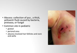 Incision and loop drainage is a minimally invasive technique for treating subcutaneous abscesses in children. It involves making two small incisions, draining the pus, and placing a sterile loop or strip inside to drain externally without further packing changes. A retrospective study found it was safe and effective for abscesses, simplifying postoperative care without repeat visits. It reduces scarring, pain, and costs compared to traditional packing changes. The loop can be removed by any provider after one week.