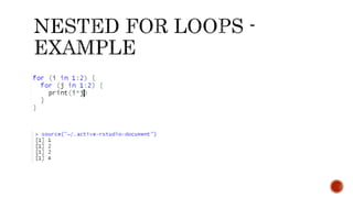 This document discusses different types of loops in computer programming including for loops, nested for loops, while loops, repeat loops, and the break and next keywords. For loops are entry-controlled and iterate over a known sequence. Nested for loops run multiple inner loops within an outer loop. While loops are also entry-controlled but are used when the number of iterations is unknown. The break keyword exits a loop entirely, while next skips the current iteration. Repeat loops run continuously until a break condition is encountered.