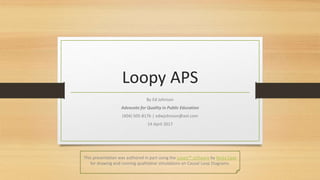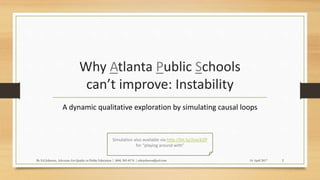 The document discusses the challenges and opportunities for improvement within the Atlanta Public Schools (APS) system, emphasizing the impact of stability versus instability on educational quality. It utilizes causal loop diagrams to explore various factors, such as public ethics, authentic education, and democracy, that contribute to the effectiveness of the educational environment. The author advocates for a transformation from a destabilizing corporatocracy to a more stable, reinforcing system to enhance public education.