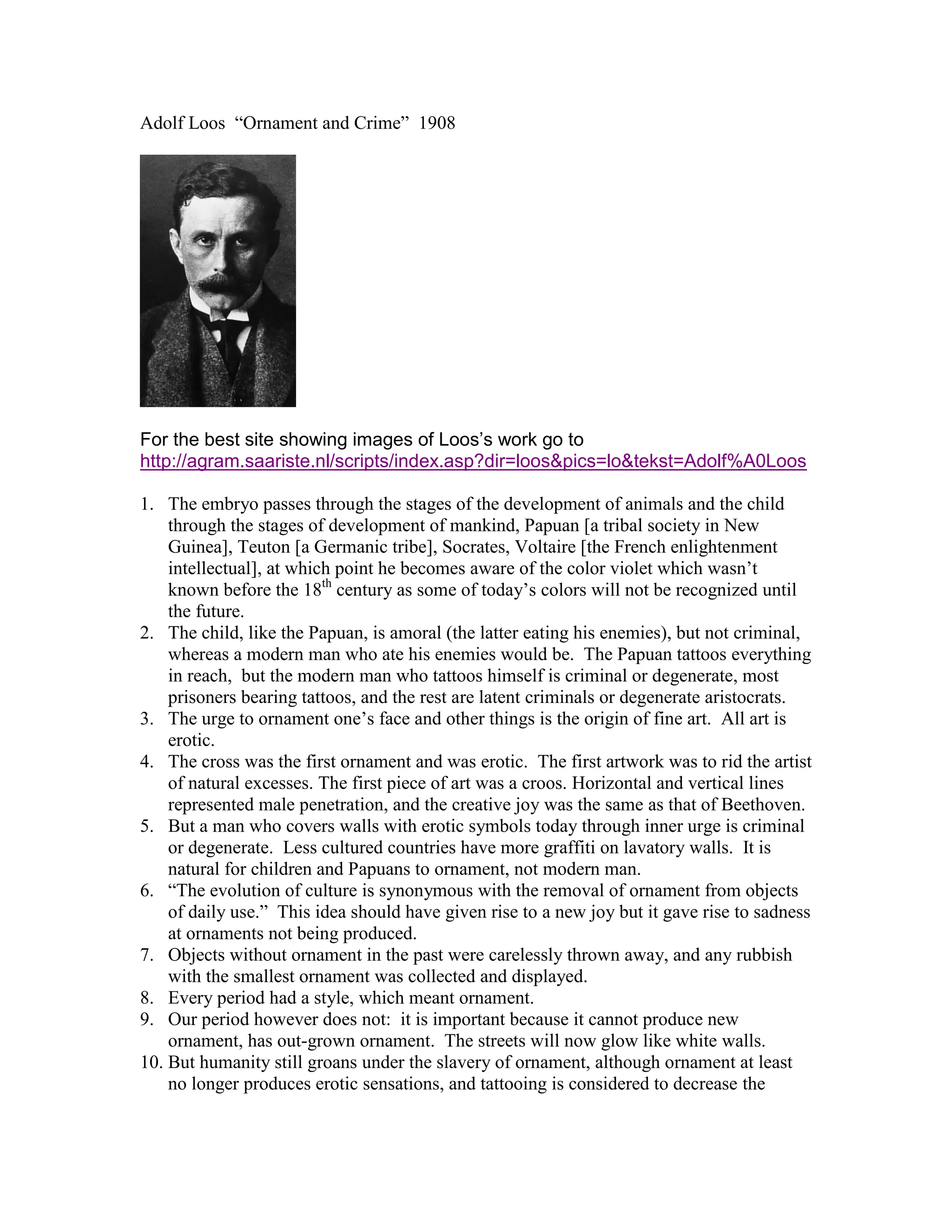 1. Loos argues that ornamentation is no longer organically related to modern culture and instead reflects earlier, less developed stages of human evolution. Ornamentation in the modern era is a sign of degeneracy or criminality.