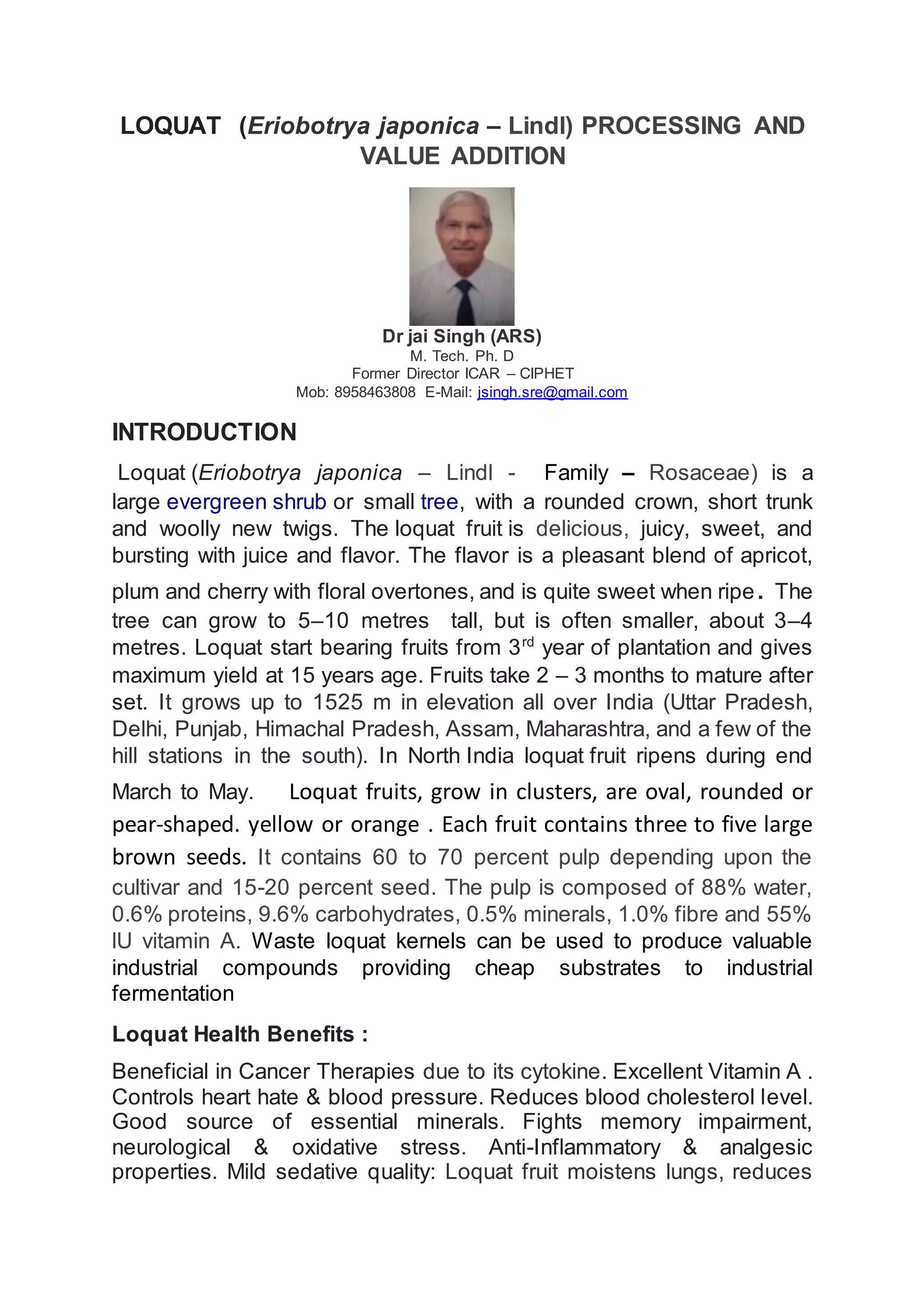 Loquat is a shrub or small tree that bears sweet, juicy fruit. It grows in many parts of India and fruits from March to May. The fruit can be eaten fresh or used to make products like jam, jelly, dried slices, juice, and more. Proper harvesting, grading, packaging and storage help maintain quality. The fruit provides many health benefits and can be enjoyed in various recipes when fresh or preserved. Zero energy cool chambers allow storing loquats to avoid market gluts and extend availability.