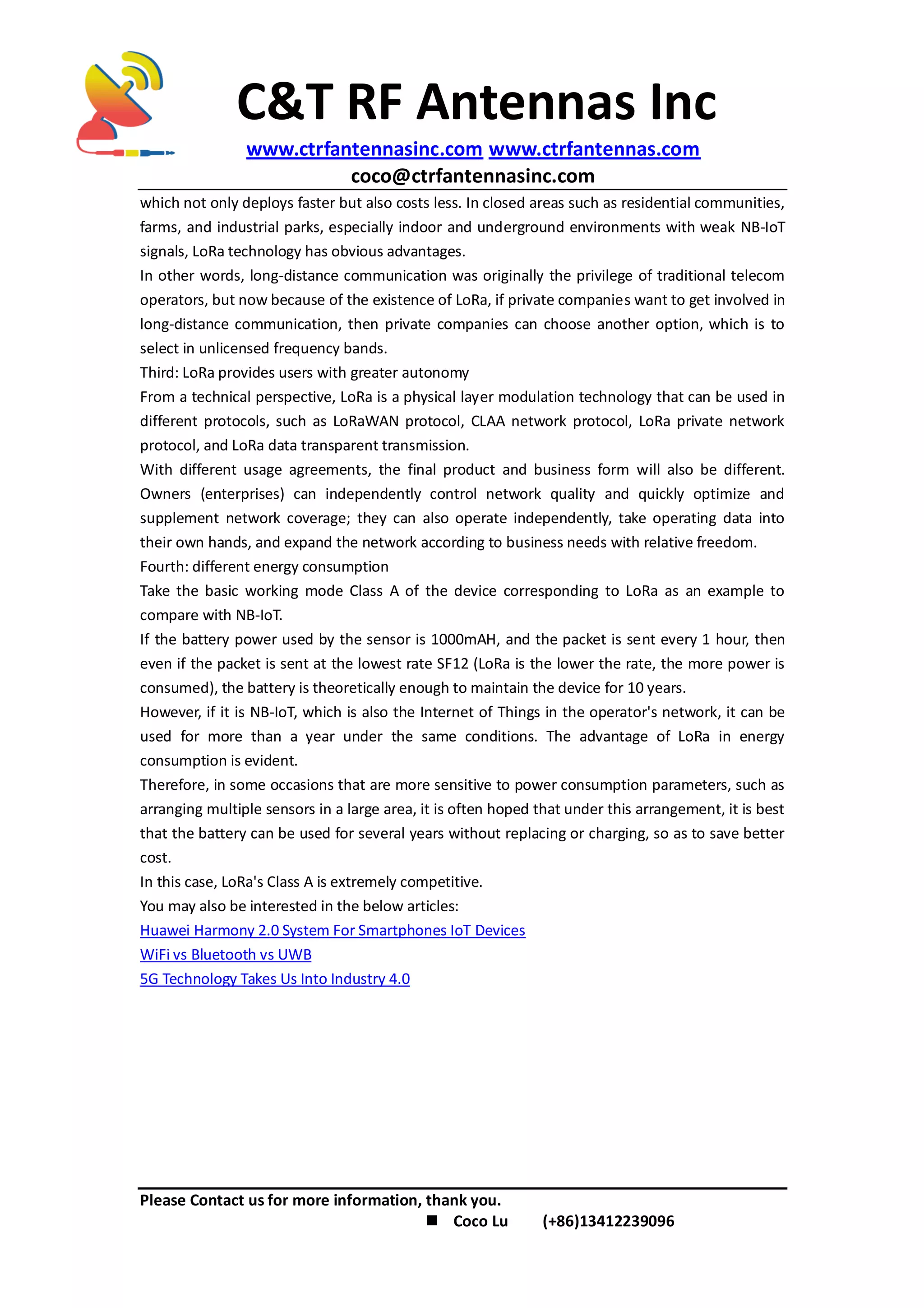 C&T RF Antennas Inc provides information on Lora and NB-IoT technologies. Lora operates in unlicensed frequency bands promoted by internet companies, while NB-IoT operates in licensed bands used by telecom operators. Operators can charge for access to NB-IoT networks, whereas private companies independently build and operate Lora networks without operator fees. Lora also provides greater autonomy over network quality and coverage compared to NB-IoT. In terms of energy consumption, devices using Lora's Class A mode can last over 10 years on a single battery charge, giving it an advantage over NB-IoT for sensors requiring multi-year battery life.