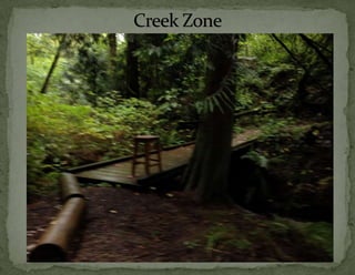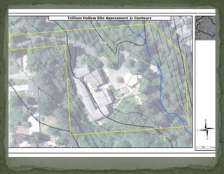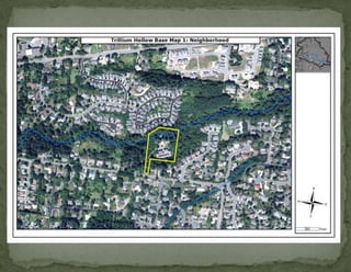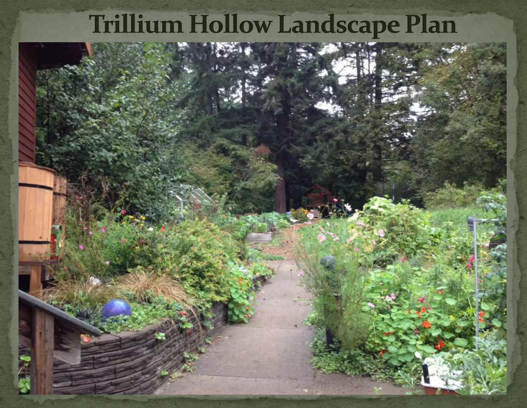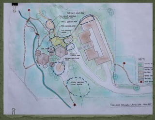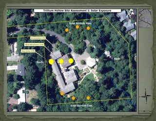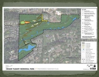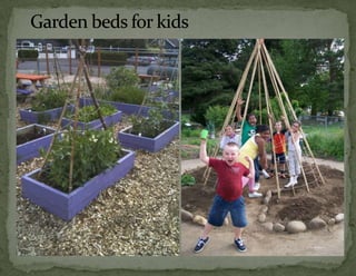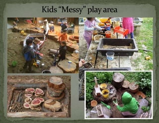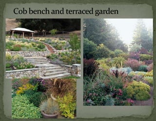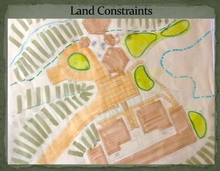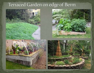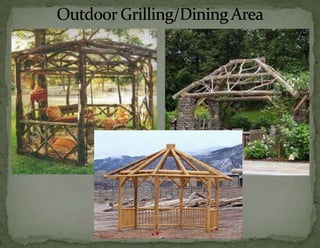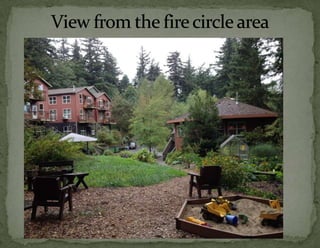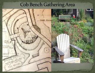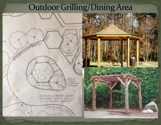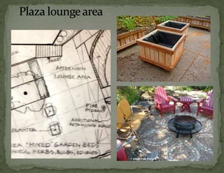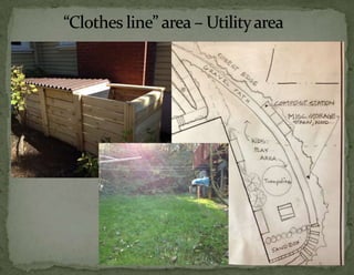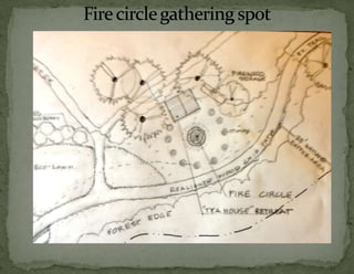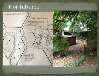 The document provides information on landscaping priorities and projects for an eco-village community. It lists areas that are nice and well-maintained, as well as overgrown areas needing attention. It then outlines priorities from community members for improving outdoor spaces, as indicated by dot voting, including creating a fire pit gathering area, more open green spaces, and kids' nature play areas. The notes section provides additional context around some of the priorities.