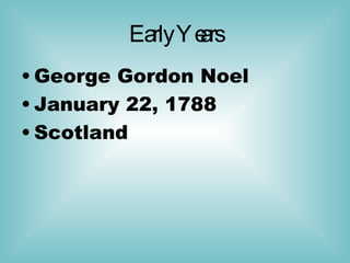 George Gordon Noel Byron was a famous English poet in the early 19th century known for poems like "She Walks in Beauty" and "There Be None of Beauty's Daughters." He had a turbulent personal life, being forced into debt and exile from England, as well as several romantic affairs and two failed marriages. Byron traveled extensively throughout Europe and used his experiences as inspiration for many poems before his untimely death in 1824 at age 36 from a fever during a rainstorm in Greece.