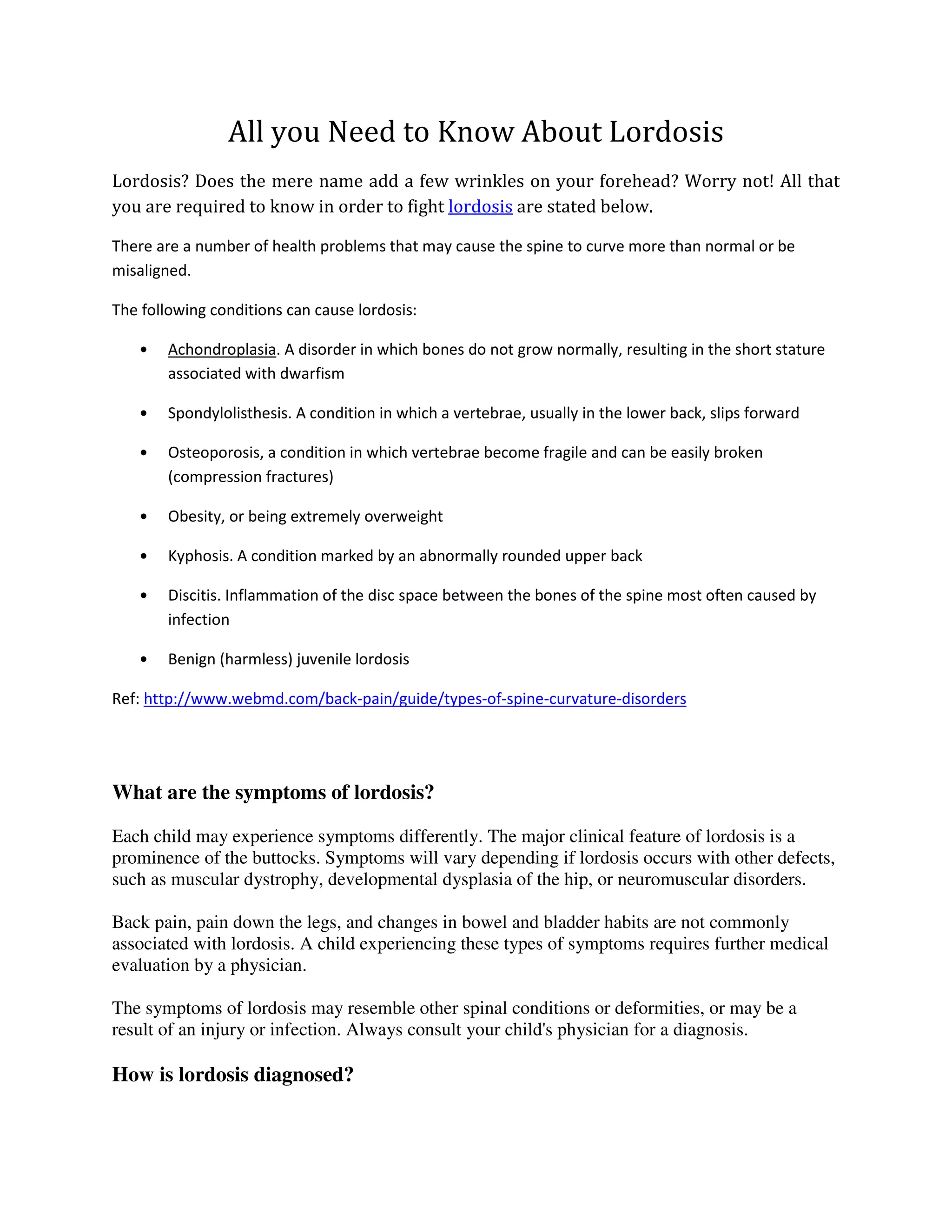 Lordosis is an abnormal curvature of the spine that causes an inward curve of the lower back. It can be caused by conditions like achondroplasia, spondylolisthesis, osteoporosis, obesity, kyphosis, discitis, or benign juvenile lordosis. Symptoms vary depending on the cause but may include prominence of the buttocks. Lordosis is diagnosed through medical history, physical exam, and tests like x-rays, bone scans, MRI, CT scans, and blood tests. Treatment depends on the individual and cause but aims to stop curve progression and prevent deformity, sometimes through exercises or treatment of the underlying condition.