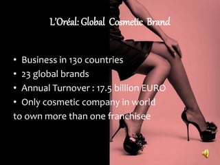 L'Oreal is a global cosmetic brand operating in 130 countries with 23 brands and annual turnover of 17.5 billion Euro. It has strengths in global presence, 66,600 employees across 130 countries, 38 factories worldwide, and reputation for innovative products. The document discusses L'Oreal's brand portfolio and classification, campaigns like Colour of Hope for ovarian cancer research, Maybelline's success and brand strategy. It faces challenges in maintaining brand differentiation across its portfolio and targeting the right audiences. L'Oreal's future plans include entering new markets, increasing e-commerce, and launching organic and innovative new products.