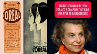 Eugene Schuller formed a company in 1990 that sold hair dyes to hairdressers. L'Oreal uses an integrated marketing communications approach including advertising, sales promotion, events, public relations, digital marketing, and personal selling. L'Oreal has 35 international brand ambassadors like Jane Fonda, Jennifer Lopez, and Beyonce.