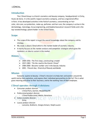 The document provides an overview of L'Oreal, the world's largest cosmetics company. It discusses L'Oreal's history, mission, operations through four divisions, key aspects of its beauty business model, industry key success factors, SWOT analysis, PESTLE analysis, Porter's five forces model, and competitive profile matrix comparing L'Oreal to competitors Procter & Gamble and Estee Lauder. The document aims to provide knowledge about L'Oreal's strategy and focuses on its market analysis and competitor strategies.
