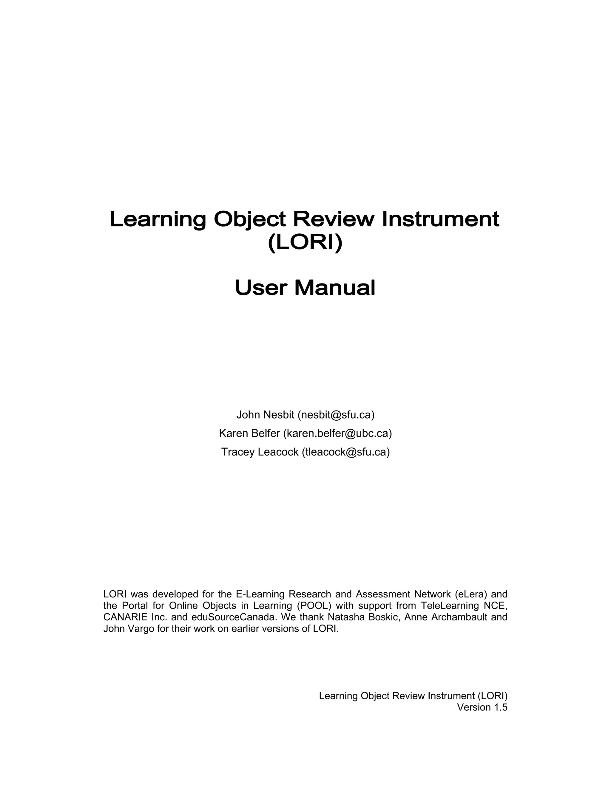 The Learning Object Review Instrument (LORI) was developed to evaluate learning objects based on 9 criteria: content quality, learning goal alignment, feedback and adaptation, motivation, presentation design, interaction usability, accessibility, reusability, and standards compliance. Each criterion is rated on a scale of 1 to 5, with options to select "not applicable" or provide comments. LORI was created for the E-Learning Research and Assessment Network and the Portal for Online Objects in Learning, with support from various organizations, to provide a common review format for selecting high quality learning objects from repositories.