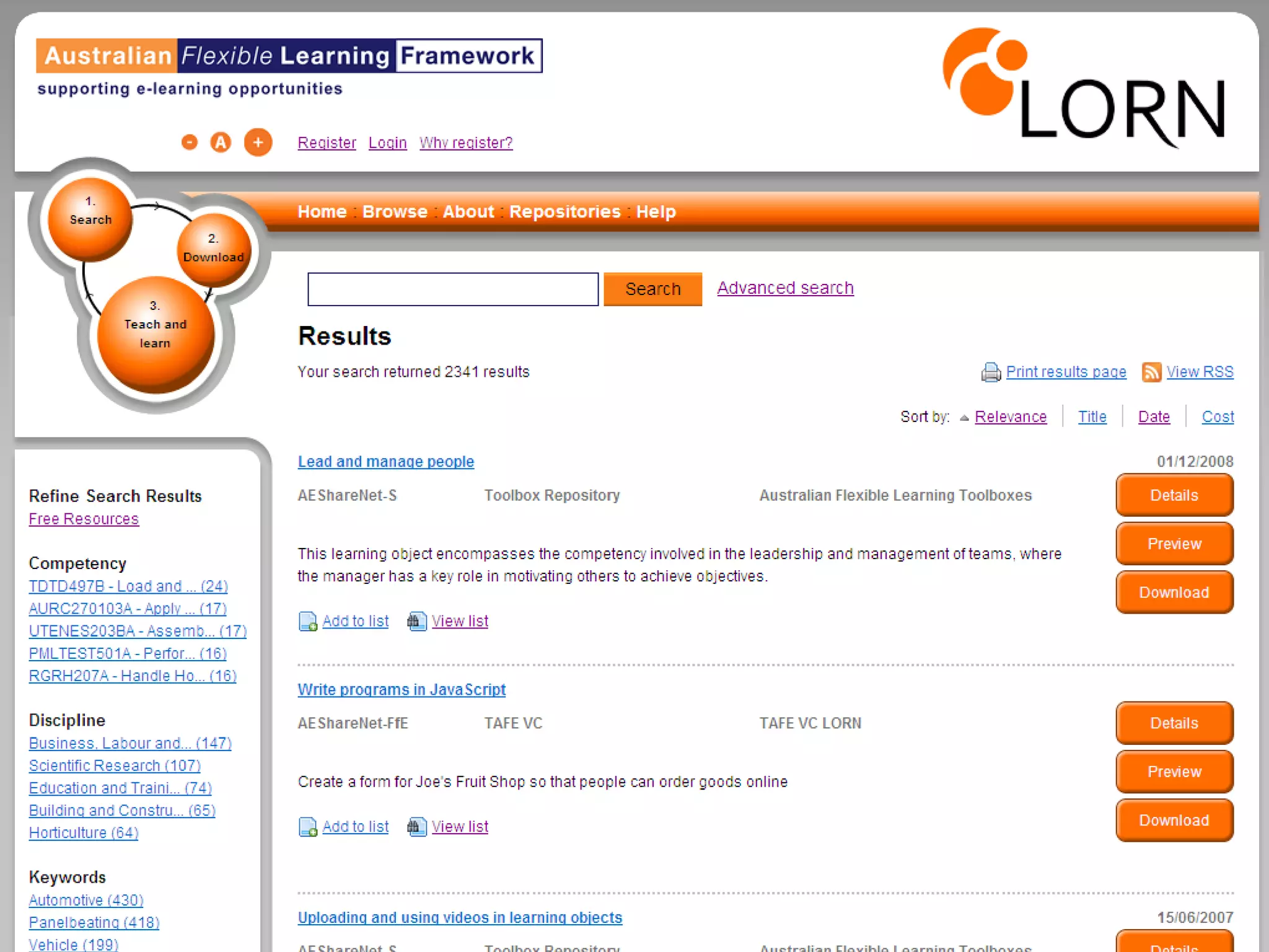 LORN is an Australian network that allows users to search and access quality training resources from multiple collections. It provides learning objects that are standards compliant and can be customized for different learning management systems. Registering on LORN allows users to save learning objects, re-download materials, and purchase additional for-cost resources.