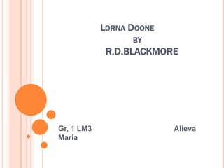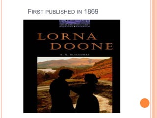 This document summarizes the 1869 novel Lorna Doone by R.D. Blackmore. It introduces the main characters of John Ridd and Lorna Doone, who falls in love despite her family, the Doones, being the hated outlaws of the region. John dreams of avenging his father's murder by the Doones. The plot follows John and Lorna's relationship being challenged by her evil uncle Carver Doone, who wants to marry Lorna himself. After many fights between John and the Doones, John ultimately defeats them and marries Lorna, having overcome the family feud to find his happy ending.