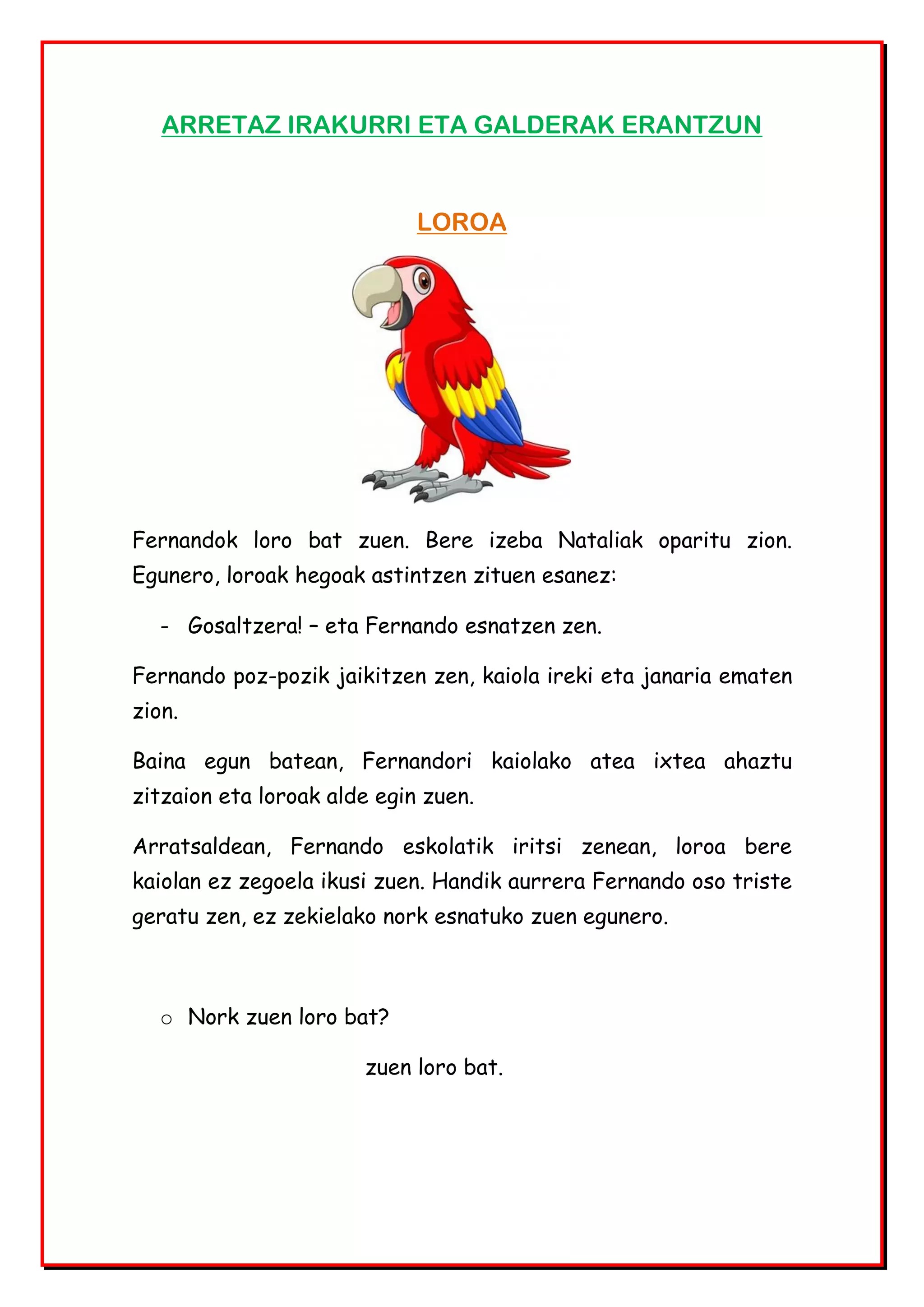 Fernandok loro bat zuen. Bere izeba Nataliak oparitu zion.
